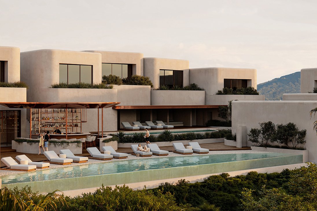 2タイプ全14室で構成される「NOT A HOTEL MIURA POOL CLUB」は、趣の異なる3つのプールをはじめ、本格的なトレーニング設備を備えたジムやサウナといった共用施設を完備。